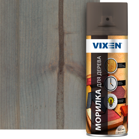 Морилка для дерева Vixen — материал на алкидной основе, предназначенный для защитно-декоративной обработки различных изделий, от мебели до предметов декора (рамок для картин, статуэток, подставок). Подходит для всех типов древесины. Выпускается в аэрозольном баллоне. Цвет — темно-серый. Объем — 520 мл. Произведено в России.